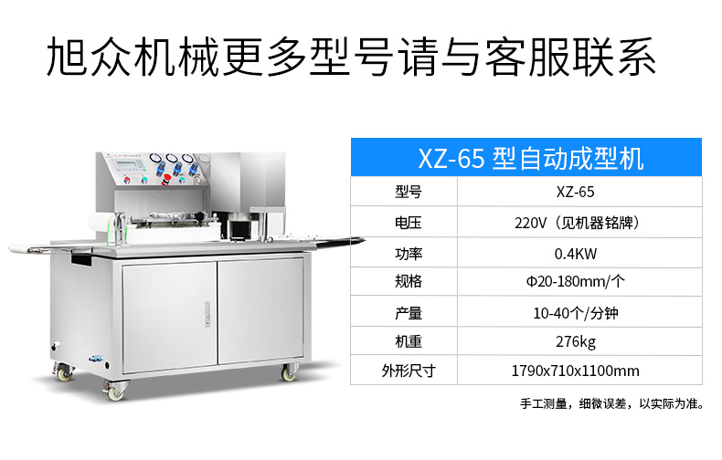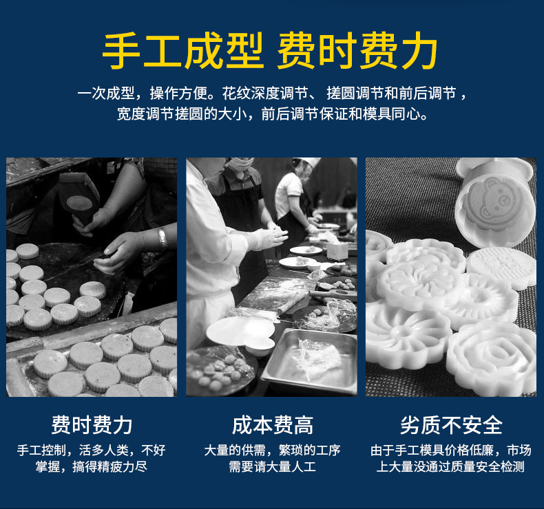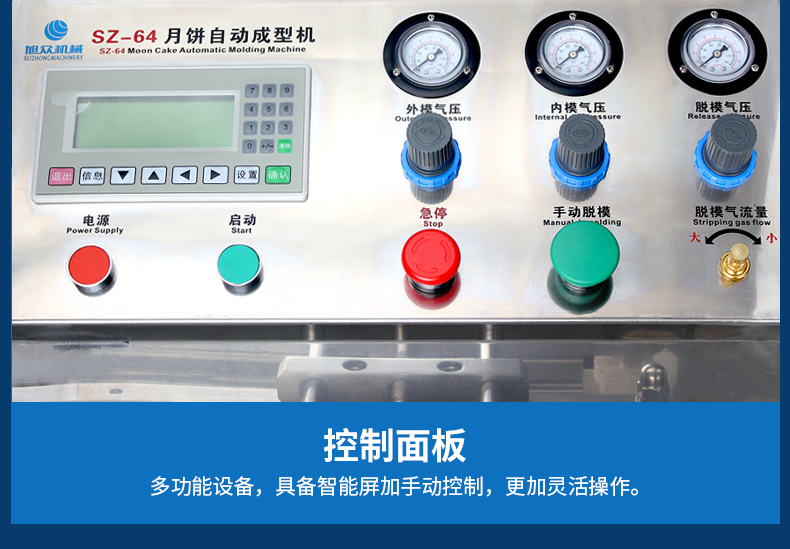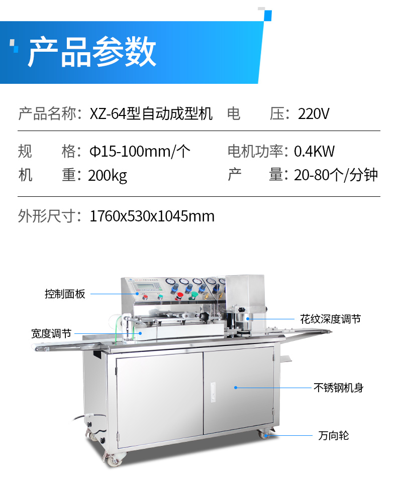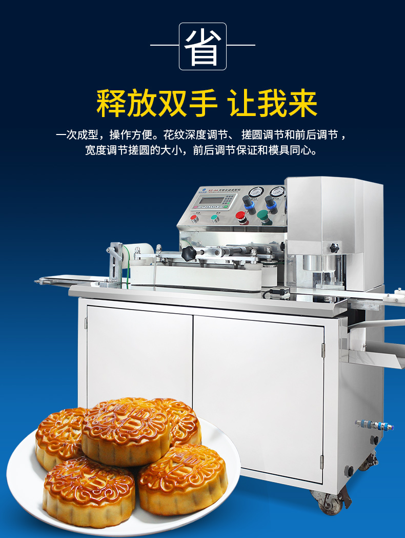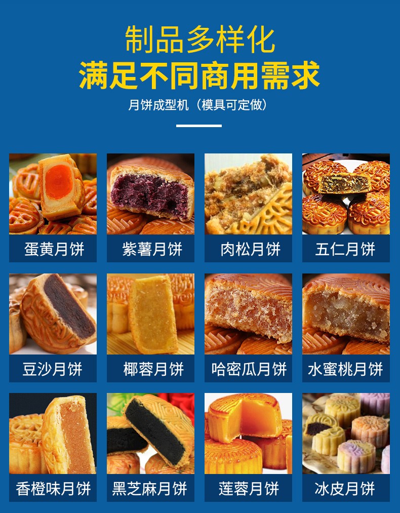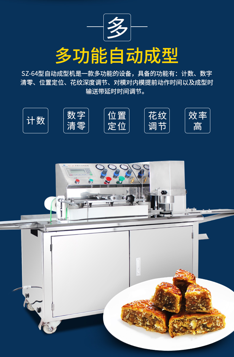 名稱SZ-64型月餅自動成型機 電源220v 功率0.4kw 產量20-80個/min 尺寸1760x530x1045mm 重量200kg 規格15-100mm 其他