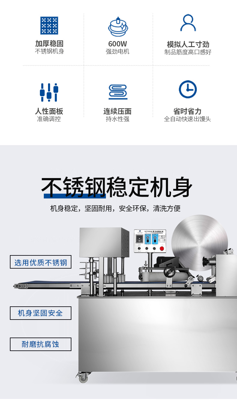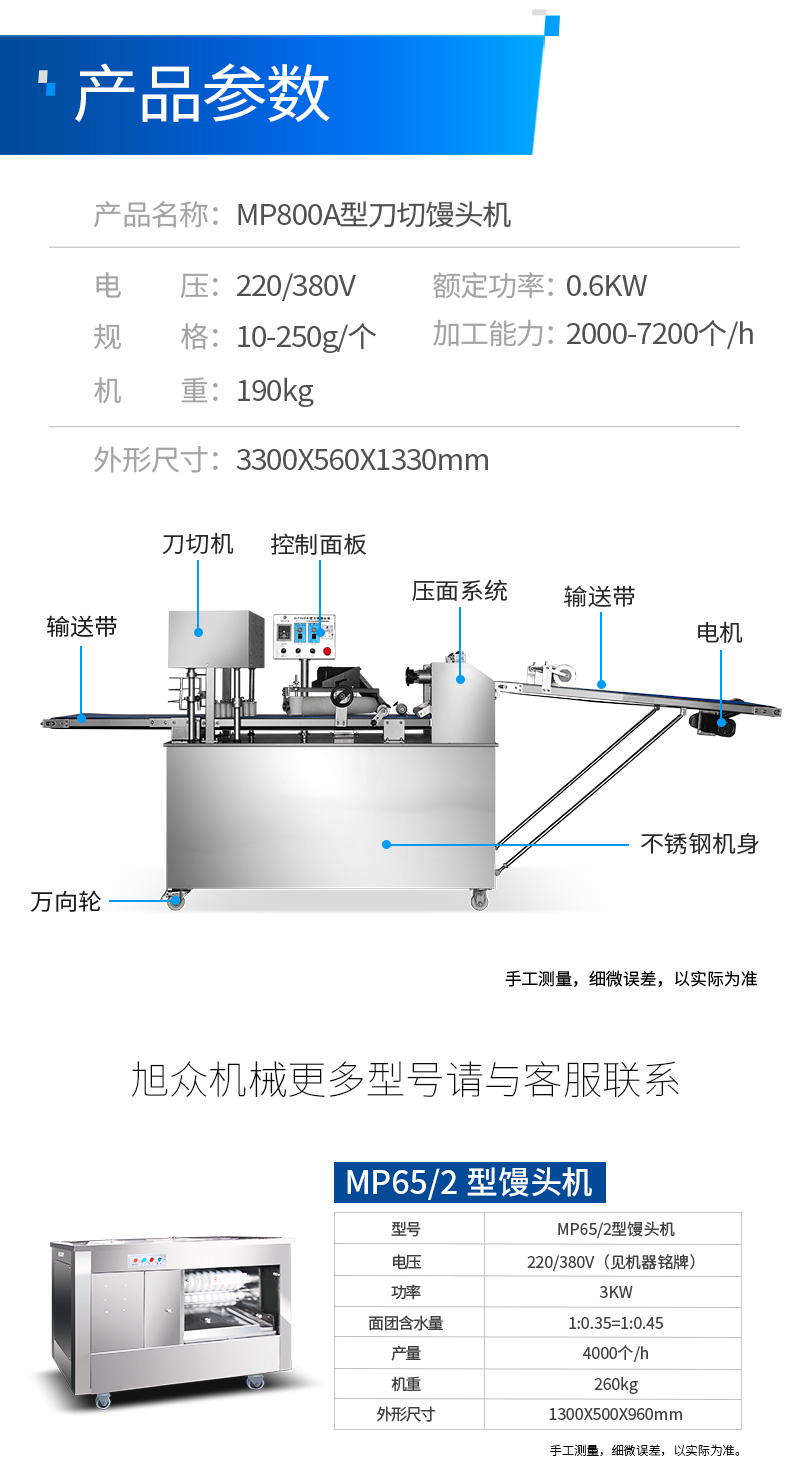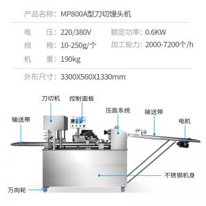 名稱MP800A全自動刀切饅頭機 電源220/380v 功率1.4kw 產量2000-7200個/小時 尺寸3300x610x1330mm 重量260kg 規格 其他